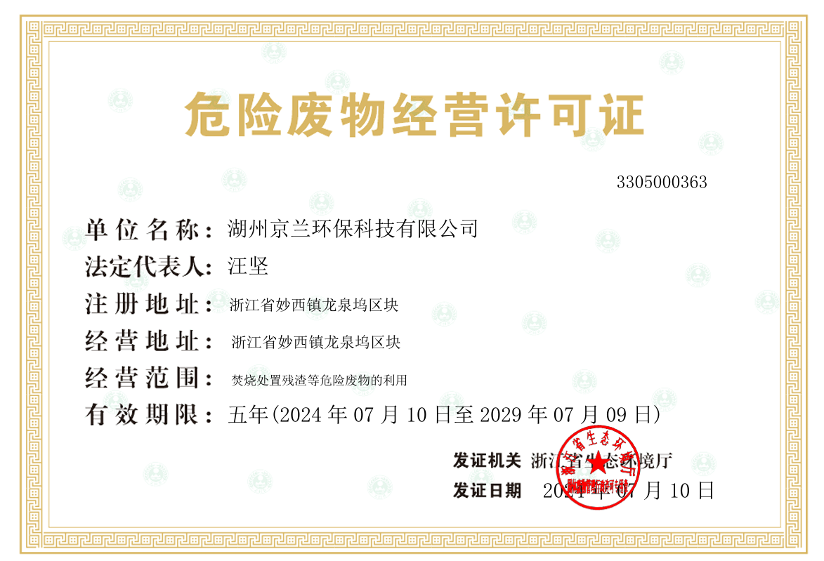喜報!湖州京蘭環(huán)保順利完成危險廢物五年期經(jīng)營許可證換證工作